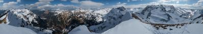 Da es ja schon zwei Weitwinkelpanos vom Südlichen, also dem höchsten der Fluchthörner gibt, ergänze ich diese hiermit mal um eine Televariante. Richtung Norden war nicht mehr so viel zu sehen, es machte erst im Laufe des Nachmittags vollständig auf. Das Fluchthorn ist ein großartiger, anspruchsvoller Berg, bei dem man definitiv froh ist, wieder heil herunter zu kommen. Der Steinschlag ist stellenweise extrem und bei den vorherrschenden Verhältnissen (Neuschnee, der den Untergrund überdeckt, aber keinen Halt bietet; kaum Altschnee in der Weilenmannrinne) werden die IIer- bis IIIer-Stellen noch etwas heikler. Ich war recht froh, dass eine Vierergruppe vor mir unterwegs war, der schloss ich mich gerne an. Gemeinsam geht´s dann doch besser, auch wenn wir nicht sonderlich flott unterwegs waren - Sicherheit geht absolut vor. 11 ausgefüllte Stunden dauerte die Tour somit gestern :-) Aufgenommen mit einer Sony NEX-6, Brennweite 55 (83)mm, 12 Einzelbilder. |