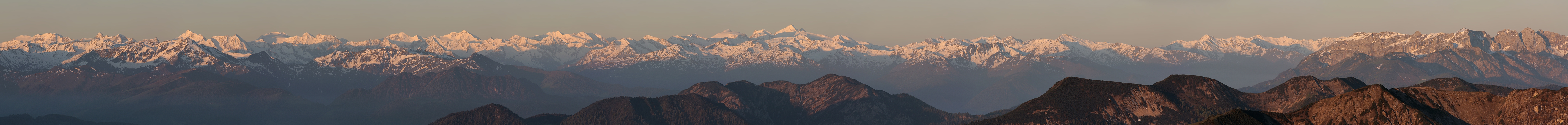 Es kommt selten vor daß man beim Blick von den Bayerischen Voralpen auf den Alpenhauptkamm die Sonne im Rücken hat. Der Regen der Vortage brachte eine gute Fernsicht darum kommt noch ein zweites Telepano.