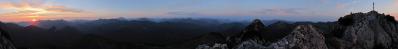 Eigentlich wollte ich ja an diesem Tag auf das Hintere Sonnwendjoch. Da aber die Mautstrasse zur Ackernalm wegen des frühen Schneefalls schon Wintersperre hatte, bin ich dann aufs benachbarte Trainsjoch gegangen. Obwohl fast 300m niedriger, hat man von hier fast den gleichen großartigen Blick auf die Alpenhauptkette, von der hohen Tenn bis zum Hochfeiler und auf die Zillertaler Alpen. Hier der Blick zu den Kitzbüheler Alpen, wo die Morgensonne gerade den Himmel erglühen lässt. Ungefähr in der Bildmitte die Preimlspitz (116km), die schon in Kärnten liegt.