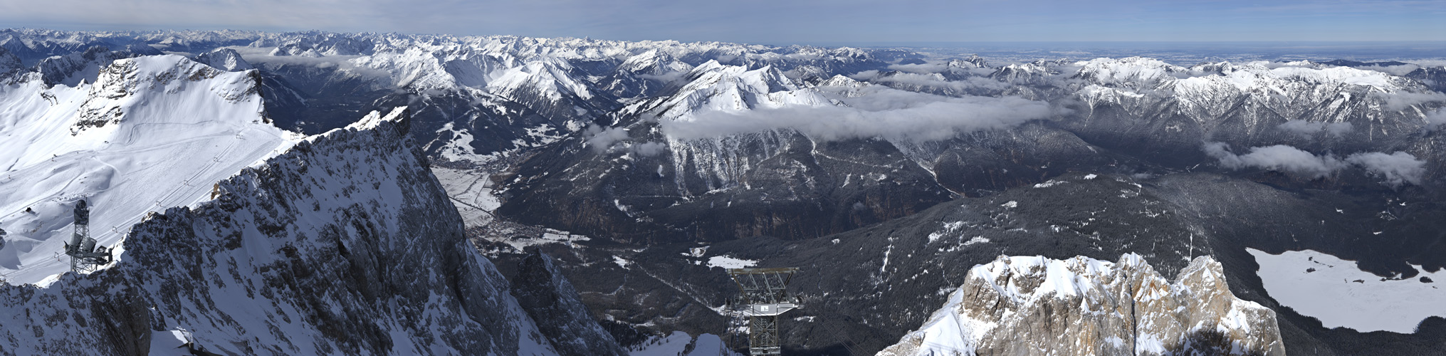 Ein gut 180 Grad Rundblick von der Zugspitze aus in südwestlicher bis nördöstlicher Richtung. Dreireihig mit EOS 5D-Mark II und dem 135mm Festbrennweite bei ISO 100, f/9