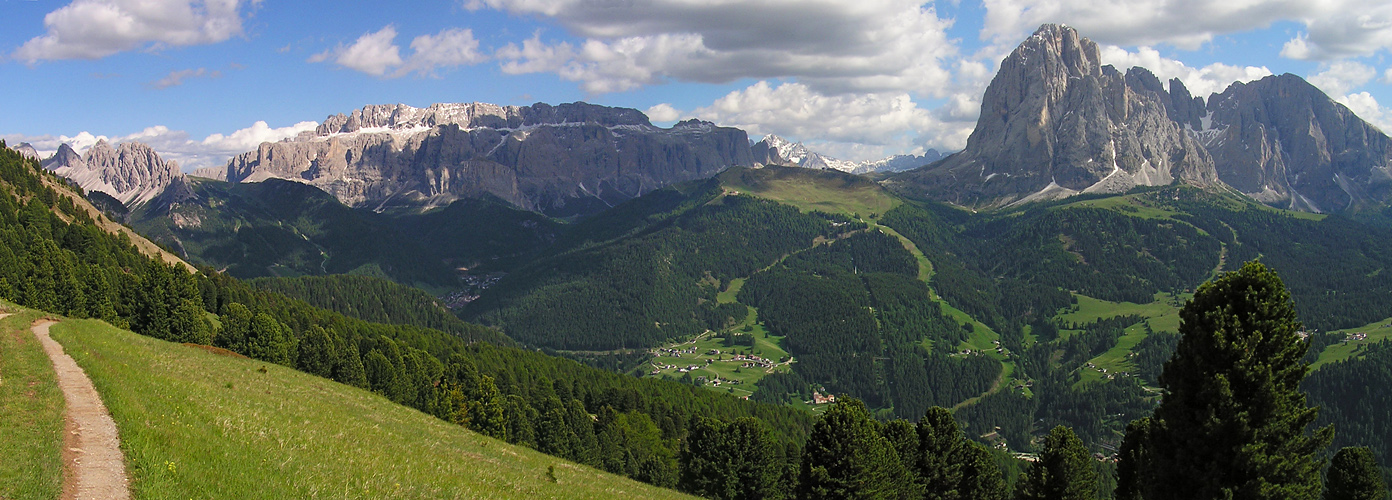 Vor nunmehr sechseinhalb Jahren hatte ich im Grödnertal das Glück, vor der eigentlichen Saison dort wandern zu können. So konnte man selbst auf klassischen Wegen wie hier dem Abstieg vom Pic nach St. Christina viel Hochgebirgsstille genießen. Erst dadurch wurde für mich das Gegenüber von Sella und Langkofel über grünen Parklandschaften zu einem unvergesslichen Erlebnis.