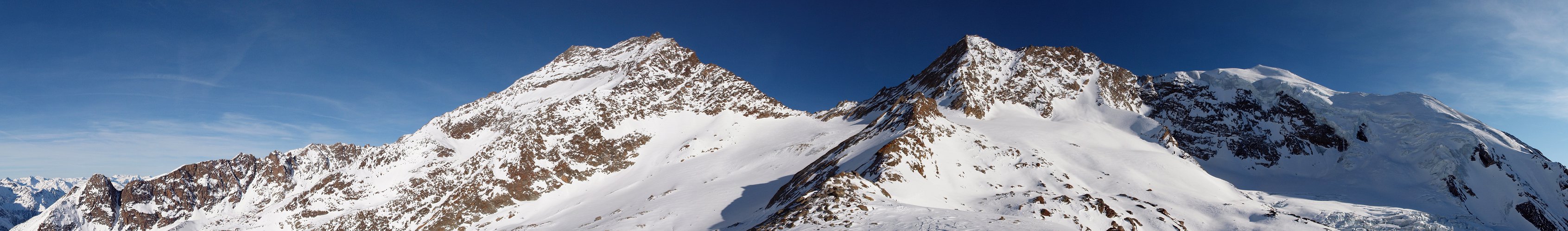 ... "Rückseite" mit niedrigeren, aber doch durchaus stolzen Viertausendern. Das Panorama ist zusammengestitcht aus 10 HF Bilder, 34 mm (KB), 1/640 sec., F 11.0.