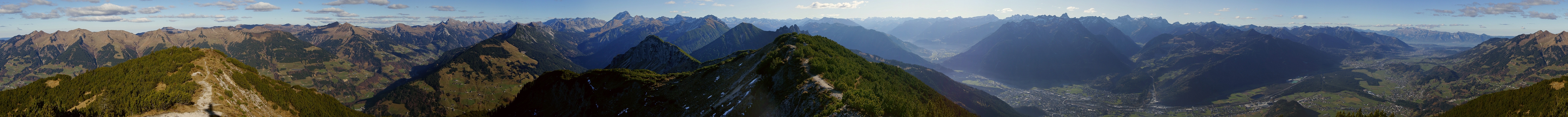 Nachdem wir bei unserer Rundtour mehr Wetterglück hatten, als Gerhard bei seiner hochsommerlichen Unternehmung, stelle ich mein Frassen-Panorama trotz dem es hier schon eins gibt, noch dazu. Ein herrlcher Herbsttag, der eine ausgedehnte Runde ermöglichte. Und sehr einsam, weil die Frassenbergbahn nicht in Betrieb war. Wir stiegen vom Parkplatz der Bergbahn über das Frassenhaus auf den Hohen Frassen, dann über den Grat weiter Richtung Osten. Vom Sattel 'hintenrum' auf die Elsspitze, und gerade hinunter nach Bludenz zurück. Der Tag reichte dafür gerade so eben aus.