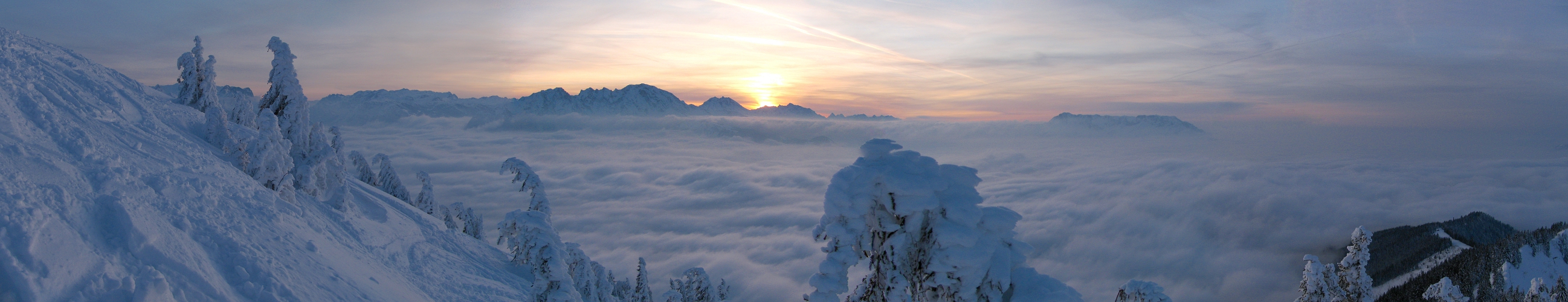 Einer meiner lieblings Tourenberge der Schlenken bei Hallein. Schon mehrere Panos entstanden hier. Diesmal nach einer ziemlich frostigen Tour am späten Sonntag Nachmittag kurz vor Sonnenuntergang. Ein paar Meter unter dem Gipfel wo der Wind noch nicht gar so stark pfif und noch die letzten zu bizaren Eisskulpturen erstarten Bäumchen den wiedrigen bedingungen trotzen hab ich versucht die letzten nicht mehr wirklich wärmenen sonnenstrahlen über der Nebeldecke einzufangen.