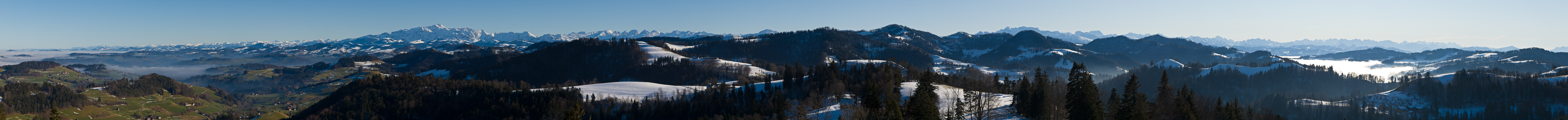 (Mein wohl einziges Winterpano in dieser Saison). 32 Hochformatbilder bei Brennweite 152 mm (KB). Der Regelsberg ist wohl nicht so bekannt wie seine Nachbarn, aber ganz bestimmt viel ruhiger. Im Westen ist es das Hörnli und im Südosten die Hulftegg, die Gegend hier nennt sich Storchenegg. Das alles liegt auf der östlichen Seite des Tösstals.
