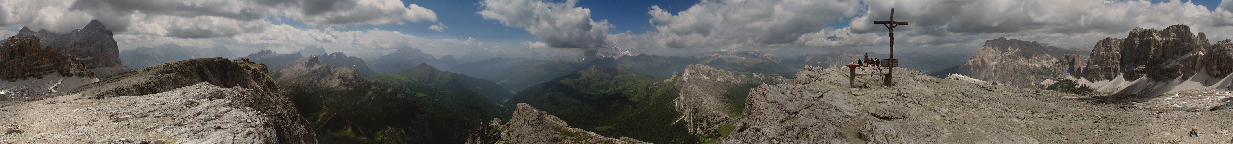 Ein Panorama bei nicht optimalen Verhältnissen und "solo" unterwegs. Vom Kleinen Lagazuoi gibt es schon sehr viele tolle Panoramen bei herrlicher Fernsicht, deshalb von mir ein 360° Rundblick vom Gipfel bei Sonne-Schatten-Wolken-Dunst-Mischwetter :-)) Auf diesen Gipfel zu gelangen ist keine bergsteigerische Leistung, führt doch eine Seilbahn vom Passo Falzarego bis zu einen Vorgipfel und von dort lediglich knapp 15 Minuten Gehzeit zum Gipfel. Aber für grössere Touren war mir das Wetter zuwenig stabil, deshalb hoffe ich, das euch mein kleiner Rundblick ein wenig gefällt. Ich habe aber an diesem Tag noch einen weiteren sehr schönen Aussichtsgipfel "erobert" (zu Fuß), mehr dazu später. Canon Powershot G10, 13 RAW-Querformatbilder, freihändig, ISO 80, 1/1000s, F/6, Brennweite: 6,1 mm (= 28 mm KB), Blickwinkel: 360°, Blickrichtung linke Seite: NO 48°, Stitcher: Hugin, Bildbearbeitung: Canon DPP, Gimp, IrfanView, Orig.datum u. -zeit: 21. Juni 2012, 11:21 Uhr MESZ (1.Bild), Beschriftung: www.udeuschle.de. |