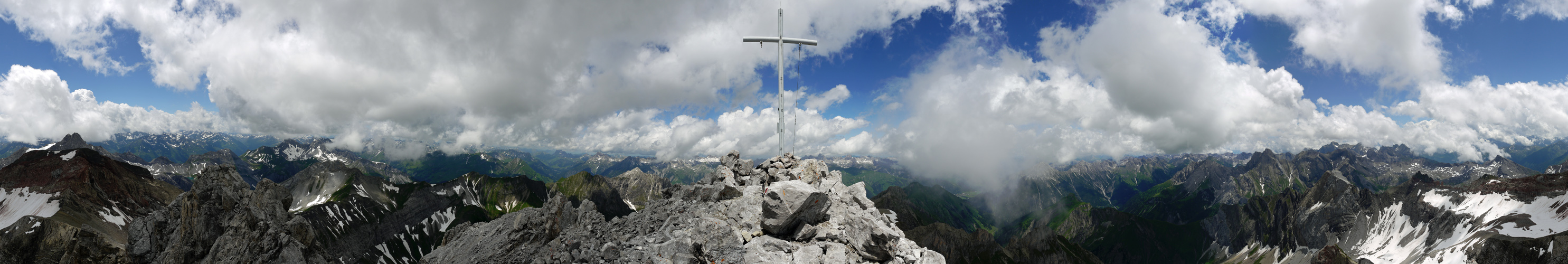 Die erste Tour dieses Sommers führte meinen Bergkumpel Joni und mich auf die Holzgauer Wetterspitze. Obwohl eigentlich herrliches Wetter angesagt war, zwang uns ein heftiger Regen kurz vor der Frederick-Simms-Hütte beinahe zum Umdrehen. Doch wir retteten uns in die Hütte und warteten, bis dann der Himmel tatsächlich etwas aufmachte. Bis wir dann jedoch am Gipfel angelangt waren, haben die Wolken fast schon wieder den kompletten Himmel zurückerobert. Trotzdem eine sehr schöne Stimmung, komplett alleine auf einem so mächtigen Felsturm zu sitzen :)