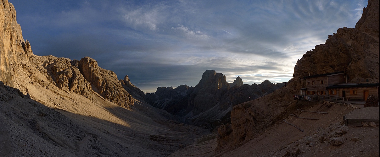 Den von Patrick hier bereits gezeigten Dolomitenabend mit tiefstehender Sonne unter Wolken erlebte ich am Grasleitenpaß im Rosengarten. Von hier ein kleiner Drittelrund nach Süd.