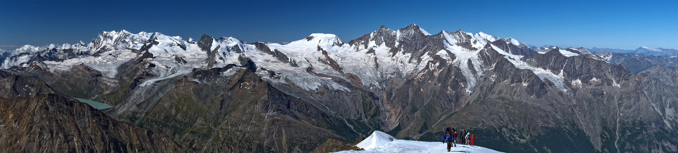 Ein Nachtrag vom letzten Sommer. Traumwetter im Wallis bei der Weissmiesbesteigung von Hohsaas. Leider wollte unser Bergführer uns weder losbinden noch allzuviel Verweilzeit gönnen. So musste ich mich photographisch mit einem Ausschnitt auf die Walliser Gigantenkette begnügen. Aber auch das ist ja schon eine Superansicht!