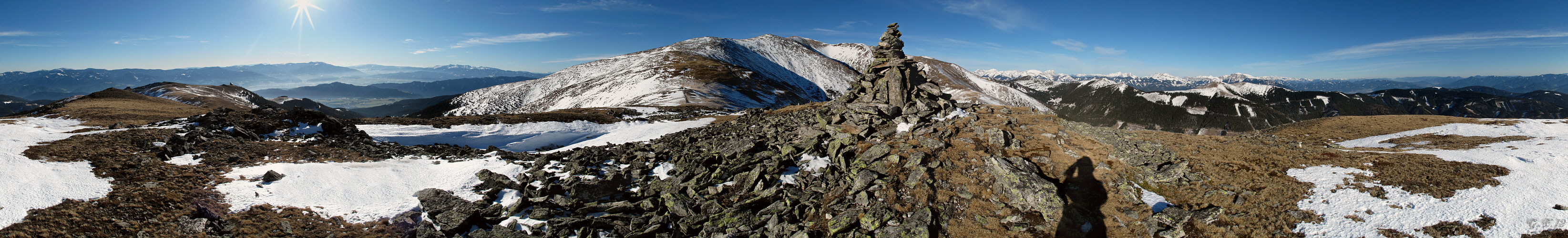 Aufstieg über teilweise vereiste Forststrassen und Steige über die Grafenalm und die Siebenherz-Alm zur Kirche Maria Schnee, weiter über die Hochalm bis zum Kumpitzstein, wo dieses kleine Panorama entstand. Wollte noch weiterwandern zu den angezuckerten Bergen im Hintergrund, aber der Wind war so stark und eisig, die Zeit auch etwas knapp, dass mir dieser kleine Gipfel genügen musste. Wie man sieht ist Schnee in meiner näheren Heimat zurzeit Mangelware. Bin dann noch zur Kirche auf ein stilles Gebet gegangen... Aufstieg ca. 2 1/2 Stunden, Abstieg über den selben Weg. *************************************************************** Ich wünschen allen Foristen und stillen Betrachtern nur das Beste für 2013, viel Glück und Gesundheit und viele wunderschöne Touren und gelungene Fotos. Liebe Grüsse Gerhard. ***************************************************************** Canon Powershot G10, 18 RAW-HF-Bilder, freihändig, ISO 80, 1/800s, F/4, Brennweite: 6 mm (= 28 mm KB), Blickwinkel: 360°, Blickrichtung linke Seite: 108°, Stitcher: Hugin, Bildbearbeitung: Canon DPP, Gimp, IrfanView, Aufnahmedatum u. -zeit: 31. Dezember 2012, 11:51 Uhr MEZ (1.Bild), Beschriftung und Ausrichtung: www.udeuschle.de. |