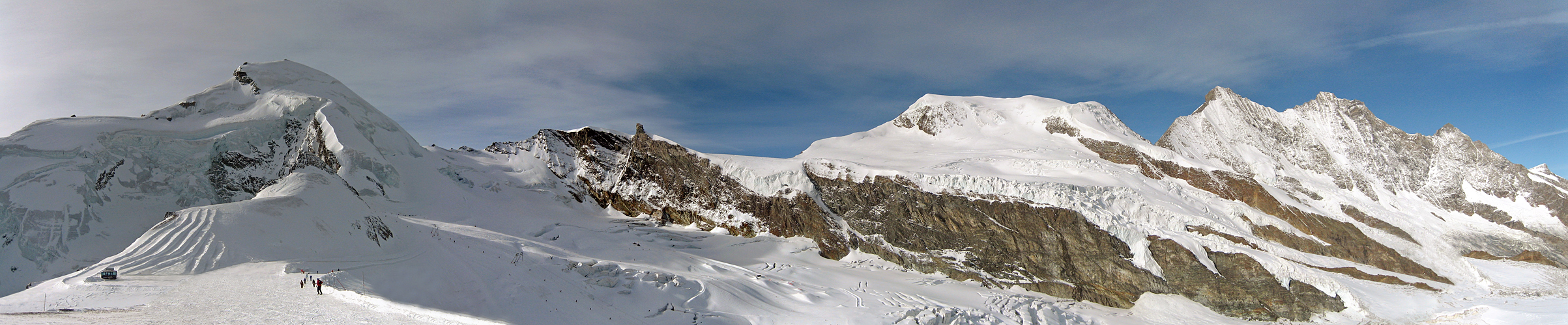 Looking at old pictures shot almost 7 years ago in Feegletscher in Saas Fee, I found that some of them could be, with a little work, arranged to create a panoramic view over Allalinhorn, Alphubel and Mischabel. The small Canon IXUS 55 I brought with me did an acceptable job.