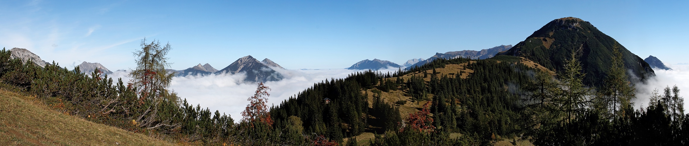 Beim Aufstieg von Pertisau Richtung Stanser Joch zeigte sich die Landschaft zunächst nur im Nebel. Nach Erreichen der Obergrenzen öffnete sich eine ruhige Herbstlandschaft. 16 Aufnahmen, 24mm.