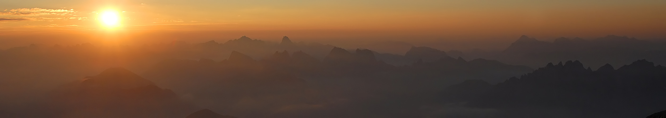 Sonnenaufgang von der Terrasse des sehr kleinen Rifugio Torrani unterhalb des Civetta-Gipfels. Der Blick geht Richtung Südost. Leider kenne ich in diesem Teil der Dolomiten fast keine Gipfel und wäre über Hilfe bei der Beschriftung sehr froh