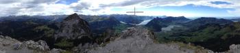Es sollte eine ruhige Frühlingstour werden mit Einsamkeit am Gipfel. Deshalb machte ich mich bereits um 03.00 Uhr in der Früh auf den Weg. Alles lief wie geplant. Ich hatte lediglich nicht berücksichtigt, dass es Sonntag war und auf dem Grossen Mythen eine kleine Hütte steht in der zahlreiche gleichgesinnte übernachteten um den Sonnenaufgang zu erleben. Ein schneller Blick in die Runde, ein kurzer Schluck aus der Trinkflasche und schon machte ich mich auf zum Kleinen Mythen. Dort hoffte ich, weil etwas Kletterkünste gefragt waren, zu finden was hier nicht möglich war und ich hatte Glück! Schnell das Stativ aufgebaut, Nodalpunktadapter und Kamera justiert und losgelegt. Schade nur, dass Saharastaub die Fernsicht trübte und den Himmel zum Glühen brachte. Egal, schön wars.