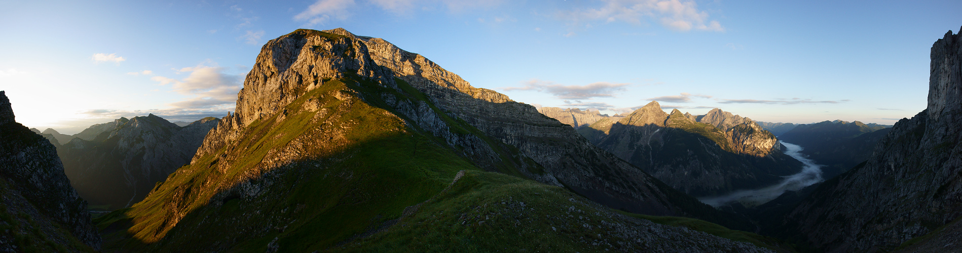 Hier der Blick vom Bärenlahner Sattel auf den Gipfel und in die Täler. Oben am Gipfelanstieg lag noch etwas Neuschnee von letzter Nacht.