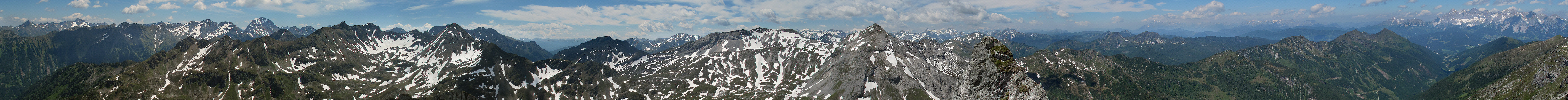 Nachdem ich in letzter Zeit viele Panoramen mit SEHR VIEL Vordergrund und Tiefblicken gezeigt habe, hiermit einmal eines mit etwas mehr "Weitblick"... Das ist eine eigenständige Semi-Tele Version vom Gipfel der Kampspitze und KEIN Crop. Die Weitwinkel Version habe ich hier gezeigt: http://www.alpen-panoramen.de/panorama.php?pid=25795&ds, Touren Bericht und mehr Infos ebenfalls dort... Liebe Grüsse Technisches: Canon Powershot G10, 40 RAW-HF-Bilder, freihändig, ISO 80, 1/800s, F/4,5, Brennweite: 26 mm (= 121 mm KB), Blickwinkel: 316°, Blickrichtung linke Seite: 56°, Stitcher: Hugin, Bildbearbeitung: DPP, Gimp, IrfanView, ..., Aufnahmedatum u. -zeit: 22. Juni 2014, 11:03 Uhr MESZ (1.Bild), Beschriftung und Ausrichtung mit udeuschle.de. |