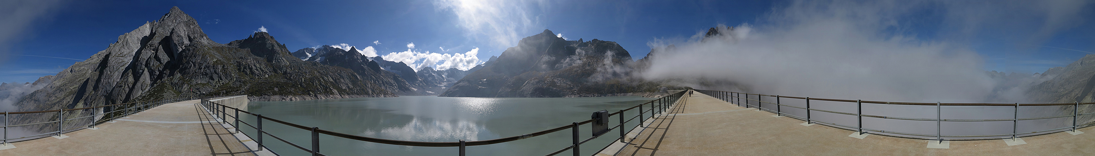 Bei der Rückkehr von der Albigna-Hütte staute sich das Wolkenband über die Staumauer und gab fast einen Tunnel im Nebel.