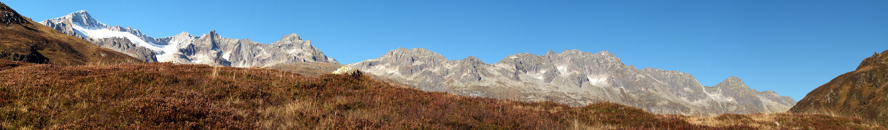 Schönes Spätherbstpano mit dem Galenstock an den ich wunderbare Erinnerungen habe - liegt hinter dem Grasrücken der Rhonegletscher?!