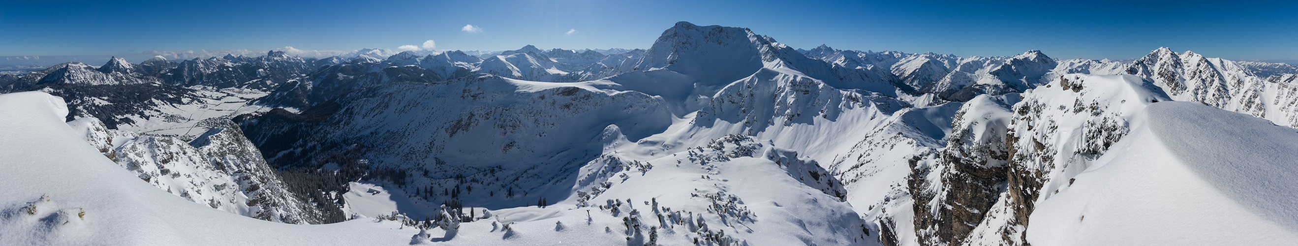Dazu demnächst auch das entsprechende Bild. Zuerst einmal allerdings ein älteres Panorama von der Rohnenspitze, die einen großartigen und bis zum Parkplatz des Skigebiets durchgehend im Tiefschnee befahrbaren Nordosthang bietet, der an diesem Tag noch komplett jungfräulich war :) Am Gaishorn gegenüber war schon deutlich mehr los - kein Wunder, auch das ist eine lohnende Angelegenheit, wenn auch ziemlich überlaufen. Aufgenommen mit einer Sony NEX-6, Brennweite 18 mm, 13 Einzelbilder. |