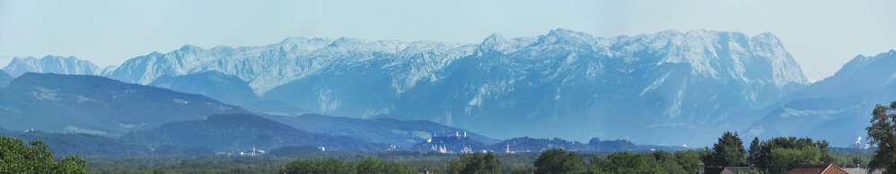 So bleibt hier der Eindruck einer in Mitten eines weiten Gletscherbeckens eingebetteten Stadt mit den dort thronenden repräsentativen Bauwerken. Die Burg des Tennengebirges schließt das weite Salzachtal satt und definitiv ab. Der Blick aus der Ecke Laufen / Oberndorf nach Salzburg ist mit meiner ganzen Kindheit und Jugend verbunden, die Fototechnik wird dieser Bedeutung mal wieder nicht gerecht... 4 QF Aufnahmen mit Zoom mit der Canon Powershot SX 120 IS Hugin, Nachbearbeitung/ Schärfen und ein manueller Stitch mit PS 3 Beschriftung mit AV Karte