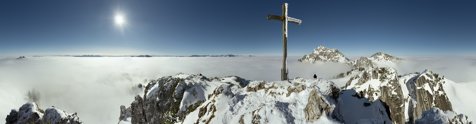 Mein 100. Pano! Kein wahnsinnig spektakuläres Bild, aber trotzdem ganz nett mit dem Nebelmeer. Vielmehr freue ich mich hier über die Tatsache, dass das Pano aus 2 Reihen zusammengebaut ist. Und das freihand, da kein Stativ dabei. Der immer wieder heraufziehende Nebel machte es auch nicht einfacher. Aber irgendwie hab ichs dann doch hinbekommen. Jeder der den Lacherspitz kennt weiß, dass es oben nicht viel Platz gibt, und ohne einem "richtigen" Weitwinkelobjektiv bekommt man das große Kreuz nicht drauf. Deshalb die Idee 2 Reihen zu machen. Und da der Gipfel so mit Kreuz hier noch nicht präsentiert wurde passt es auch ganz gut. ########### Danke an die Community für die freundliche Aufnahme und die immer wieder spannenden, interessanten und informativen Beiträge! ########### Aufgenommen mit Sony Alpha 6000, SEL1855. 2 Reihen a 10 HF Bilder alle Bilder exakt gleich belichtet F10, 1/640sek., ISO100, Brennweite 18mm (27mm). LR, Hugin, PS CS5.