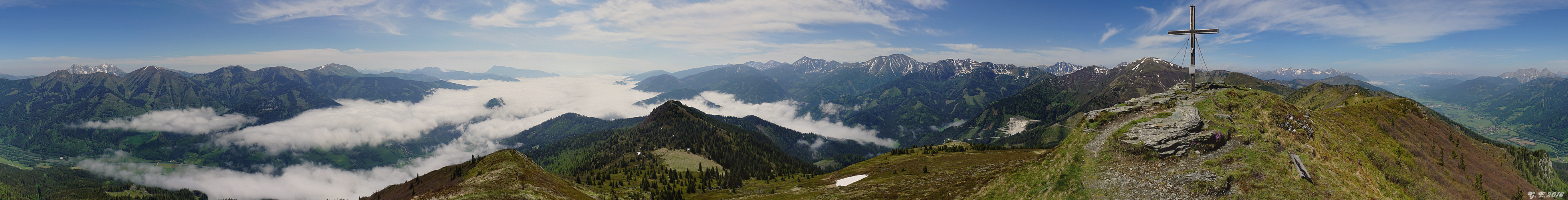 Ich habe auch diesen Sonntag einen Morgen- bzw. Vormittagsspaziergang unternommen ... :-) Aufstieg von Wald am Schoberpass beim Sportzentrum (841 m), die Forststrasse und Steige zur Schwarzbeer Alm (1.440 m) und weiter vorbei beim kl.Schober auf den Gipfel des Großen Schober wo dieses Panorama entstand. Seit Neuestem gibt es am Gipfel auch eine kleine Sendeanlage (oder Wetterstation), daher war der "Panorama-Standplatz" (habe mich um Selbigen gedreht) bereits vorgegeben... Nächtliche schwere Gewitter und dichter Nebel beim Aufstieg ließen frühmorgens eine fast unheimliche Stimmung in mir aufkommen... und natürlich eine AP Erstbesteigung... ;-) 1.060 Hm, ca. 3 Stunden Aufstieg und 1 3/4 Stunden Abstieg... Liebe Grüsse Technisches: Sony Alpha 6000, Sony SEL 16-70 mm ZA, F/4, Carl Zeiss Vario-Tessar T*, 22 RAW-HF-Bilder, freihändig, ISO 100, 1/160s, F/11, Brennweite: 16 mm (= 24 mm KB), Blickwinkel: 360°, Blickrichtung linke Seite: 336°, Stitcher: Hugin, Bildbearbeitung: RAW-Therapee, Gimp, IrfanView, ..., Aufnahmedatum und -zeit: 29.Mai 2016, 9:57 Uhr MESZ (1.Bild), Beschriftung und Ausrichtung mit udeuschle.de.