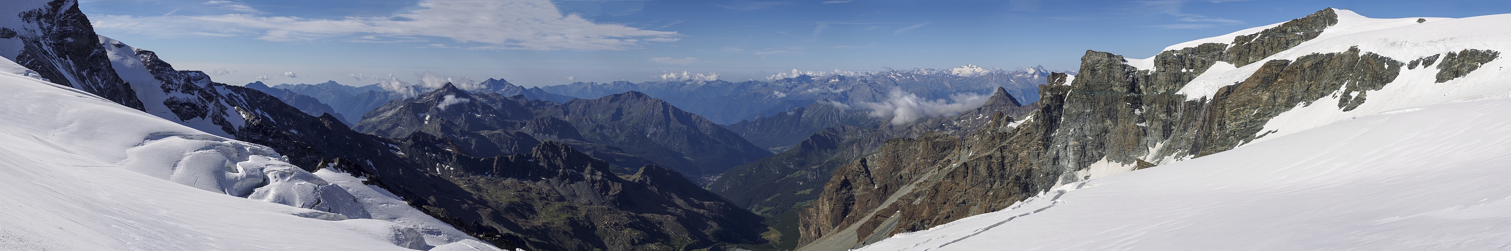 Danach geht es üblicherweise aufs Breithorn (zu voll, und auch mein mitgehender Sohn war letztes Jahr schon oben und der mitgehende Panoramisierer muss dann eben noch mal separat rauf...) und idealerweise die volle Traverse (da hatten wir nicht genügend Zeit und Skill). Also sind wird untenrum direkt Ri Castor. Da hat man aber auch nette Aussichten. Die hier präsenten Freunde von Breithornplateau und Gobba di Rollin wird's vielleicht freuen...