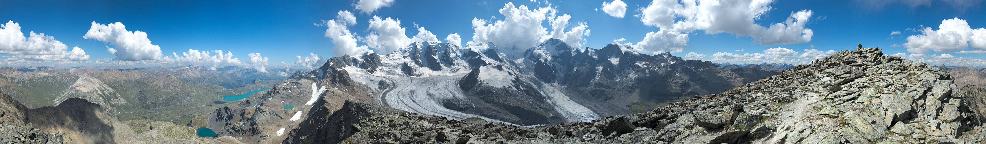 Christoph, der Blick auf den Morteratsch-Gletscher und ins Bernina-Tal, den Du im anderen Panorama so gut gezeigt hast, verleitet dazu, aus den beiden eine Gesamtsicht zu machen. Doch Du wirst uns jetzt erst mal mit Tele-Aufnahmen überraschen. Trotzdem muß ich zu diesem Panorama wieder das gleiche sagen, was ich beim anderen schon gesagt habe, daß ich trotz der schönen Wolken einen Beschnitt gemacht hätte. Es fällt mir nämlich hier auch schwer, die Konturen der weiter entfernten Berge so auzumachen, daß man ihre Gestalt erkennt.