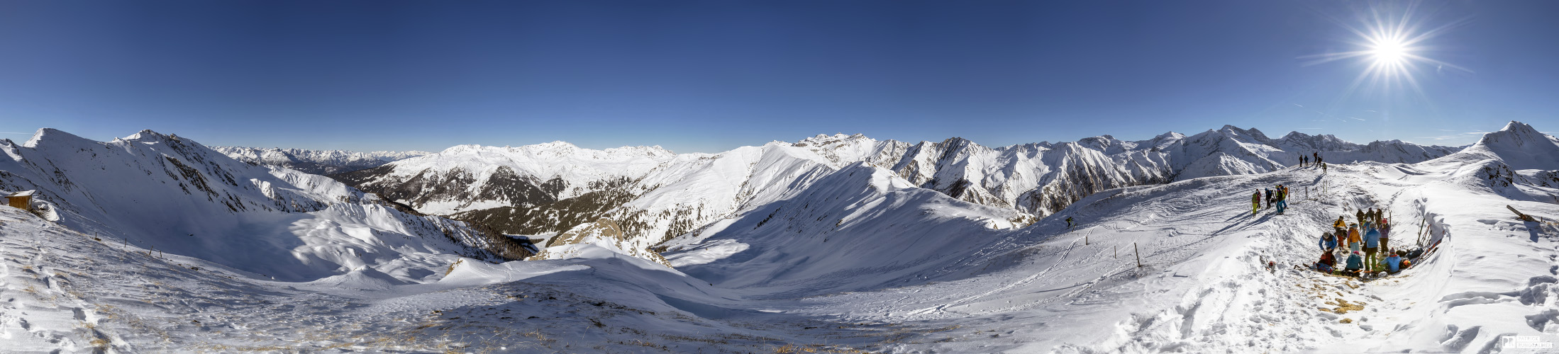 Skitour im Navistal über vielseitiges Touren-Gelände hinauf zur Scheibenspitze. 15 HK Aufnahmen, f 14, 1/500s, Iso 100, Bw 12 mm;