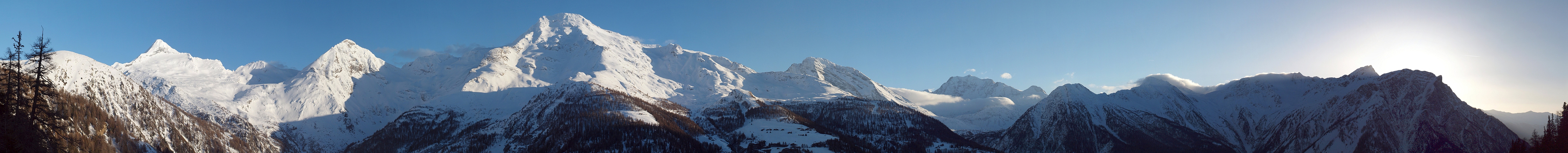 Winterwanderung Rosswald - Stafel und dazugehörender Abendblick auf die Berge um den Simplonpass. Ein Freihandpanorama aus 21 HF Aufnahmen mit 80 mm (KB), Blende 9 und 1/400 sec.