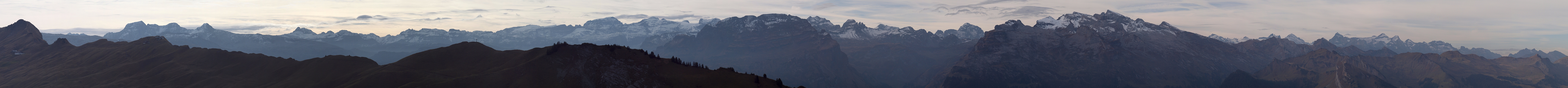 Blick aus dem schneefreien (heute nicht mehr) Skigebiet Hoch Ybrig auf die Glarner und Urner Alpen. Das Panorama besteht aus 29 HF Aufnahmen, freihand, 158 mm (KB), Blende 8 und 1/500 sec.