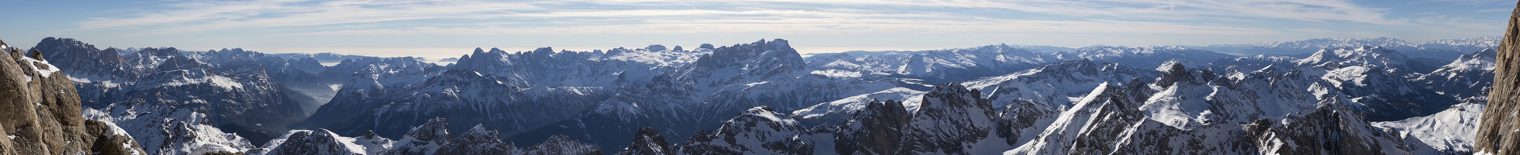 Über Grödner Joch, Corvara und Arabba arbeitete ich mich langsam vorwärts und stand - zwar etwas später als geplant - aber bei bestem Wetter um kurz vor 13.00 Uhr endlich auf der Terrasse an der Punta Rocca. Bei meinem letzten und bisher einzigen Besuch vor drei Jahren (vgl. u.a. Panorama Nr. 27855) schauten beim Blick nach Süden nur die obersten Spitzen aus dem Wolkenmeer, dieses Mal dagegen konnte ich auch in die naheliegenden Täler schauen. 16 QF Aufnahmen mit Canon EOS 5D Mark III und dem EF 70-300 f/4-5.6L á 70mm, f13, 1/320s, ISO100, 12.55 Uhr, PTGui Pro, Irfanview