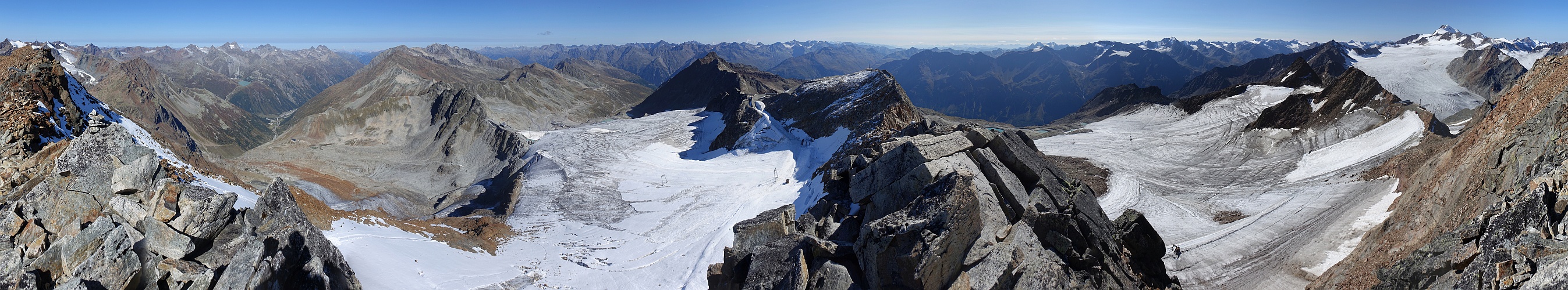 Im September verbrachten wir eine Woche in Sölden, typisch für ein gereiftes Ehepaar mit Wellnesshotel, Halbpension und Ötztalcard (alle Bahnen frei!), ohne allzu anstrengende Auf- und Abstiege. Das Wetter passte auch. Somit kann ich mich nach längerer Pause mit einigen neuen Panoramen zurückmelden. Von der Bergstation Innere Schwarze Schneid führt ein breiter Weg zu einer herrlichen Aussichtsplattform. Von dort kletterte ich über den ausgesetzten Blockgrat zum höchsten Punkt um einen Rundumblick auf die Gletscher zu erhalten.