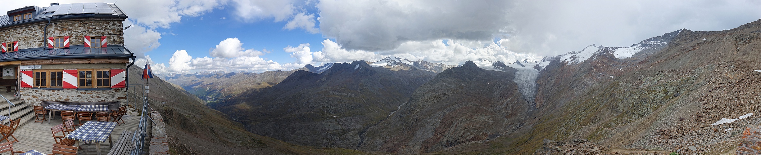 Das Ramolhaus hat eine faszinierende Lage hoch über am Ende des Gurgler Tales. Der Zustieg war 4 Std. von Obergurgl. Ich habe das Ramolhaus zusammen mit Terasse und Aussicht als Panorama abgebildet. Der Abstieg am folgenden Tag ging über die neu gebaute Piccardbrücke und die Langtalereckhütte nach Obergurgl.
