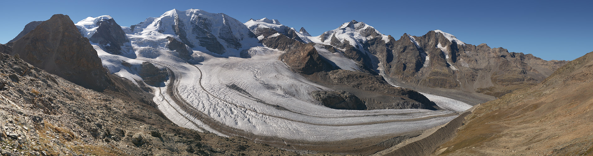 Bleiben wir doch lieber bei den beiden großen Gletschern, die man hier sieht. Die großen Verluste am Morteratsch-Gletscher kann man hier aber nicht sehen. Da muß man im Morteratschtal zu seiner Zunge wandern. Und von dort sieht man auch, daß die Verbindung zum Persgletscher, die vor 25 Jahren noch bestand, inzwischen unterbrochen ist: https://www.fotocommunity.de/photo/der-pers-gletscher-heinz-hoera/3517566 und https://www.fotocommunity.de/photo/auf-dem-rueckzugsweg-des-gletschers-heinz-hoera/27192805. Und wie stark der Mächtigkeits-Verlust beider Gletscher ist kann man beim Verleich Deines Panoramas mit einem aus dem Jahre 1896 sehen, das ich mal als Nr. 1048 hier gezeigt habe.
