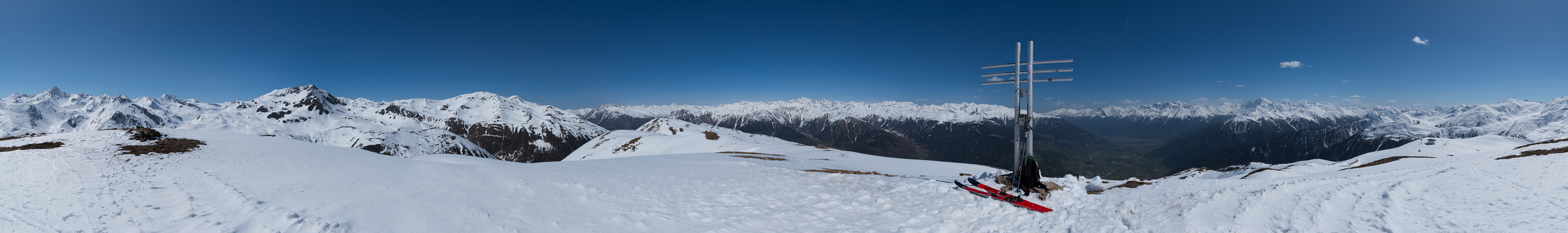 Vom Weiler Prämajur ging es zunächst entlang der offengelassenen Skipisten bis zur Bergstation und danach weiter über freies Gelände zum Gipfel (ca 3 Std.). War es weiter unten noch Windstill und recht warm so blies mir hier oben der kalte Nordwind entgegen. Die 5 Grad Plus auf meinem Thermometer fühlten sich hier oben so gar nicht danach an. Die anschließende Abfahrt auf butterweichem Firn war dagegen ein Genuss.