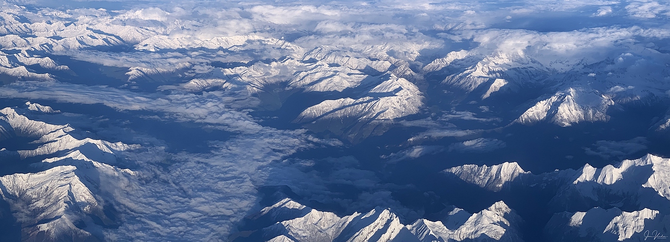 Der Flug führte von Stuttgart nach Menorca, ich saß auf der rechten Seite mit Blick gen Westen. Meine erste Aufnahme entstand um 6.38 Uhr, da erspähte ich zwischen den Wolken unter mir erstmals schneebedeckte Gipfel. Die Aufnahmen zu diesem Panorama entstanden um 6.43 Uhr, zwei Minuten danach entstand folgendes Bild: