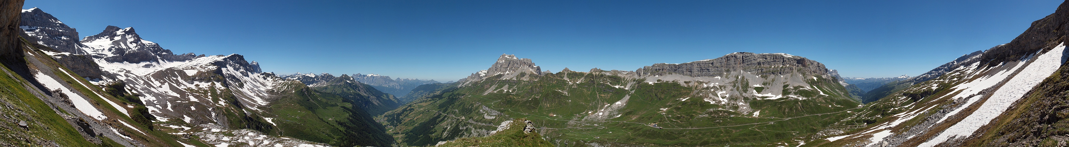 Kurze, interessante und aussichtsreiche Wanderung Passhöhe - Chammlialp und ein Panorama dazu aus 13 BF Aufnahmen, freihand, mit 28 mm (KB), Blende 9 und 1/400 sec.