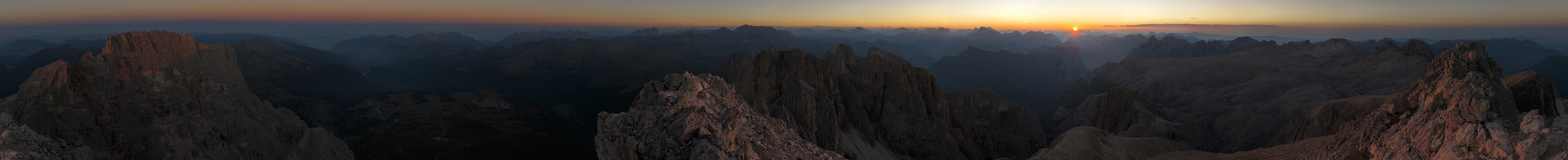 Der Blick umfasst die gesamten Dolomiten, gut auszumachen sind die Langkofelgruppe oder die Marmolada. Ganz links könnte die Cima di Vezzana sein. Den Rest muss ich raten: Cima del Bureloni ??