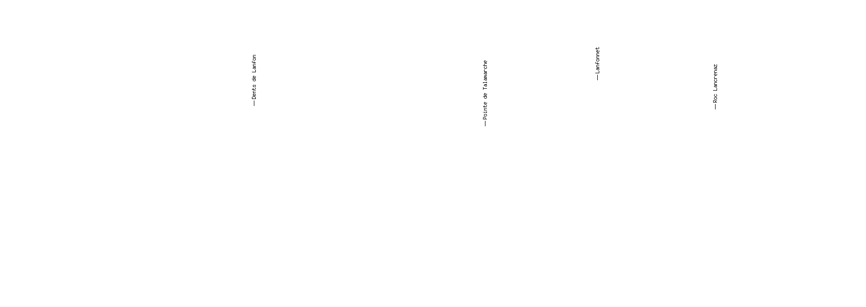 Und zwar in zweifacher Hinsicht. Nicht nur sind zwei Gipfel in dieser Teleaufnahme zu sehen, sondern die Panoramaverarbeitung erfolgte für zwei Panoramaversionen simultan, denn vom selben Standort hatte ich auch Weitwinkelmaterial fotografiert. Praktischerweise muss man dann nur einmal das Bild in die Waagrechte bringen. Die Weitwinkelansicht kommt bei Gelegenheit. Auch wenn noch einmal frischer Schnee gefallen war, die Seilbahnen in Val Thorens liefen dennoch nur bis 17 Uhr in den letzten Tagen der Saison Anfang Mai. Was also machen mit dem angefangenen Tag? Zwischen Albertville und Annecy lief also meine Rückfahrt nicht über Autobahn und Chambéry, sondern über Ugine und am lac d'Annecy vorbei, mit ein zwei kleinen Fotohalten. Länge: 6.2122° Breite: 45.8035° Kamera Canon G12 Fünf Bilder Querformat mit Zoomlinse in Telestellung hugin und convert Blickwinkel 35 Grad Mercatorprojektion Beschriftung und Orientierung nach udeuschle.de