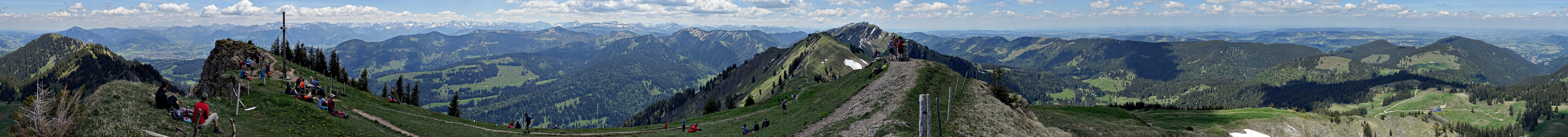 Wir hatten uns die Nagelfluh-Überschreitung ausgeguckt, mit anschließender Hörner-Runde in den Bergen südlich von Gunzesried für den Folgetag. Die ersten Gipfel Steineberg und Stuiben wurden wahrlich von den Feiertags-Tourengängern überrannt... so habe ich mich am Stuiben dennoch zu einem kleinen Pano hinreißen lassen, wobei hier im Vordergrund dann doch der Ästhetik willen einige Personen rausgestemplet sind ;-) Sony RX100 III mit 14mm (38mm) F4, 1/200 sek.