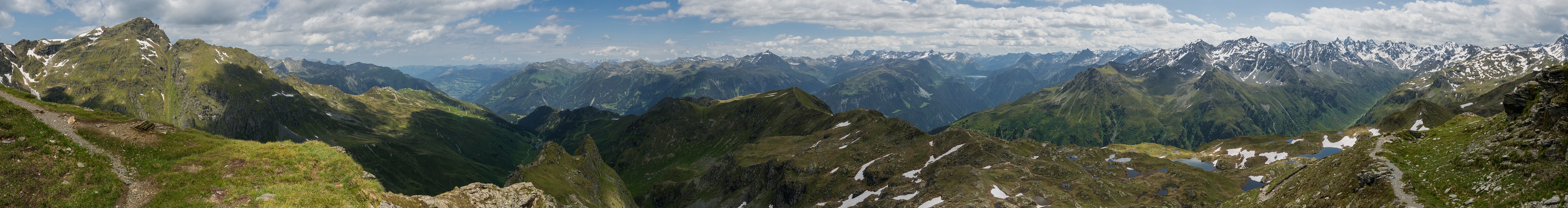 Dass ich komplett einsam im Gebiet unterwegs war, dürfte mit der geschlossenen Versettlabahn zu tun haben. Die fährt nämlich erst ab dem 10. Juli. Und wie wohl hinlänglich bekannt ist, geht das durchschnittliche Klettersteigpublikum ungern mehr als unbedingt nötig. Ich war allerdings nicht in Gaschurn, sondern in St. Gallenkirch an der Talstation der Garfreschabahn mit dem MTB gestartet. Die fehlenden 50 Grad sind dem überdimensionierten Gipfelkreuz geschuldet, um das ich mit seinen Abspannseilen recht schlecht herumturnen konnte... Aufgenommen mit einer Sony NEX-6, Brennweite 30 (45)mm, 20 Hochformat-Einzelbilder.
