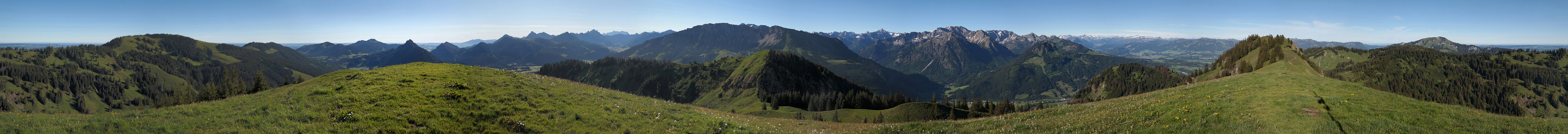 Laut der amtlichen Karte des Bayerischen Landesvermessungsamtes ist es nur eine namenlose grasige Kuppe direkt östlich vom Spieser. Bei Google Maps hat diese Kuppe den Namen Großer Hirscherg, die ich auch hier verwenden möchte. Vom Spieser sind es nur wenige Minuten auf Pfadspuren in östliche Richtung, von der Hirschalpe geht man den Weg nach Nordosten bis zum Sattel, dort links Richtung Spieser und dann weglos über die Südhänge zur flachen Gipfelkuppe. Am Gipfel steht eine Wetterstation für Drachenflieger, die allerdings das Panoramisieren sehr erschwert. Trotzdem ist dieser Gipfel der panoramistische Höhepunkt des Tages. Man muss allerdings von 3 Standorten fotografieren, was beim Stitchen weniger Freude macht. Zurück ging es über die Hirschalpe und alte Jochstraße (Pano folgt) nach Bad Oberdorf.