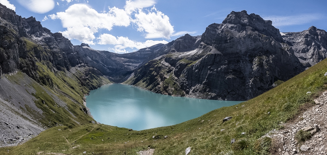 Abstieg von der Muttseehütte Richtung Kalktrittli. Auf dem Weg Blick auf den Limmerensee. 5 Aufnahmen, 18mm.
