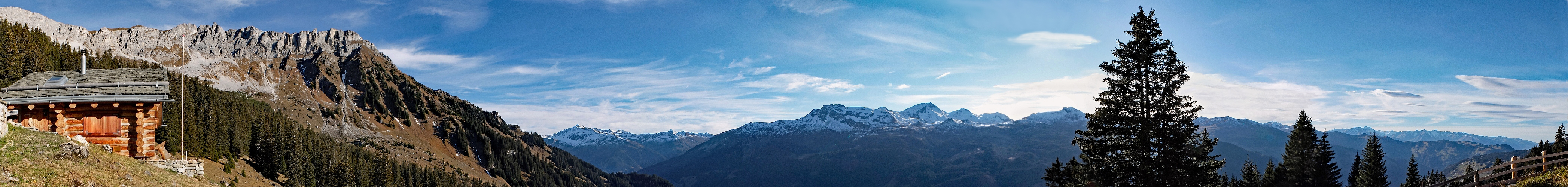die früher zum Bewirtschaften von weit abgelegenen Alpwiesen gute Dienste leisteten. Heute sind sie jedoch aufs allerbeste ausgebaut und lassen manchen von einer heilen Welt träumen... Freihandpano aus 10 HF-Aufnahmen mit f/9, 1/250s, 100 ISO, 25mm (KB) Blickwinkel ca. 240° Richtung S (Mitte)
