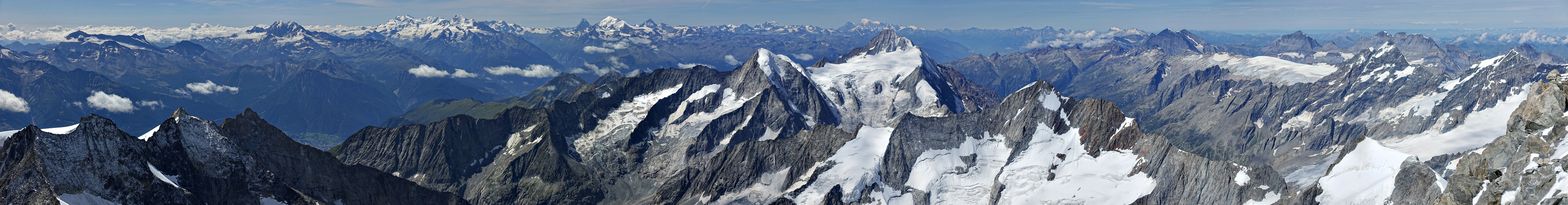 Wie versprochen liefere ich nun noch den etwas größeren Ausschnitt vom Aletschhorn mit Blick über's Wallis nach. Aufgenommen bei der Gipfelpause unterhalb es Gipfelkreuz, wo der Wind nicht gar so garstig geblasen hat.. ;-)