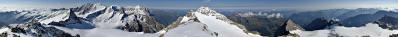 Wie angekündigt haben wir nach der Besteigung des Wetterhorns noch das nahe Mittelhorn in Angriff genommen; wir waren zwar nicht mehr ganz früh in der Zeit, wollten aber am Abend ohnehin nochmal eine Nacht auf der Glecksteinhütte bleiben und hatten dadurch keine Hektik. Der Aufstieg am Westgrat war an der steilsten Stelle im Übergang von Firn in den Fels wieder mit Blankeis gespickt, im Vergleich zu unseren Erfahrungen vom Nesthorn die Woche zuvor aber kaum der Rede wert. So war der geräumige Gipfel des Mittelhorn recht bald erreicht und da der Wind mittlerweile nachgelassen hatte, konnten wir die mittägliche Gipfelpause auch wirklich genießen – bereits erreichte Gipfel studieren, und auch über neue Tourenideen philosophieren..