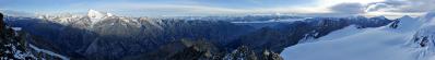Ein Traum an diesem ruhigen Spätsommermorgen von ganz oben über die Vanoise und darüber hinaus zu blicken - auf Grund der Bedingungen war vermutlich die Wochen davor niemand mehr hier oben und auch wir konnten nicht ewig bleiben, fallen doch die ersten Sonnenstrahlen zur Mittagszeit in das Couloir...