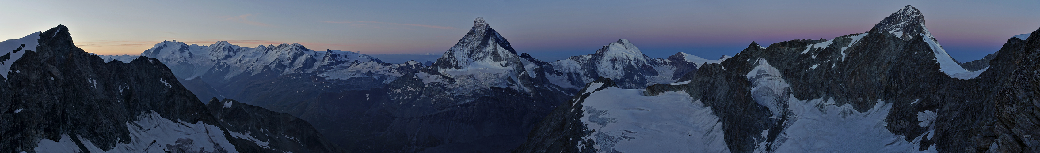 ..Nach einer kurzen Nacht beginnt der Aufstieg im unteren Teil mit der Querung eines kurzen Gletscherrestes bevor es dann in der Dämmerung eine markante Rinne diagonal hinauf in Richtung Arbengrat geht. Die gesamte Tour über ist hier das Matterhorn mit seiner Nordwand das zentrale Schaustück und so musste ich natürlich die erste Gelegenheit nutzen, um ein kleines Panorama dieser beeindruckenden Morgen-Szenerie mitzubringen.