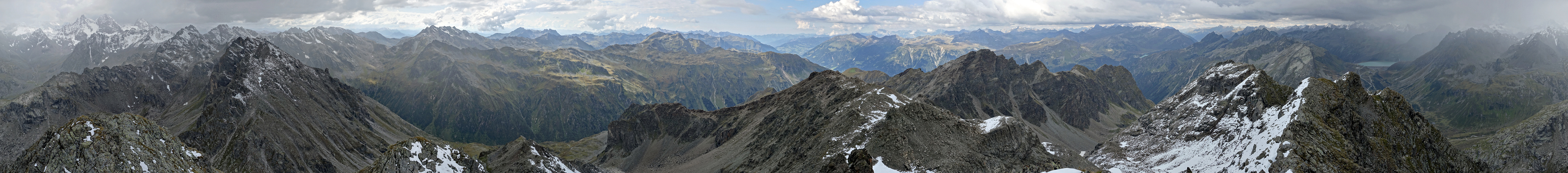 Am ersten Tag wanderten wir allerdings zunächst vom Vermuntstausee hinüber zur Tübinger Hütte und hatten Gelegenheit dabei noch dem Hochmaderer einen Besuch abzustatten. Dieser eigentlich gemütliche Wanderberg hatte mit dem nordseitigen Neuschnee jedoch auch seine Tücken und so sind nicht alle Freunde mit bis auf den Gipfel gegangen. Nicht zuletzt auch weil sich am Nachmittag wie angekündigt aus den Zentralalpen Schauer ausbreiteten und es gerade zu nieseln begann als wir oben waren. Dennoch bot sich uns ein ganz netter Ausblick hinaus ins Montafon...